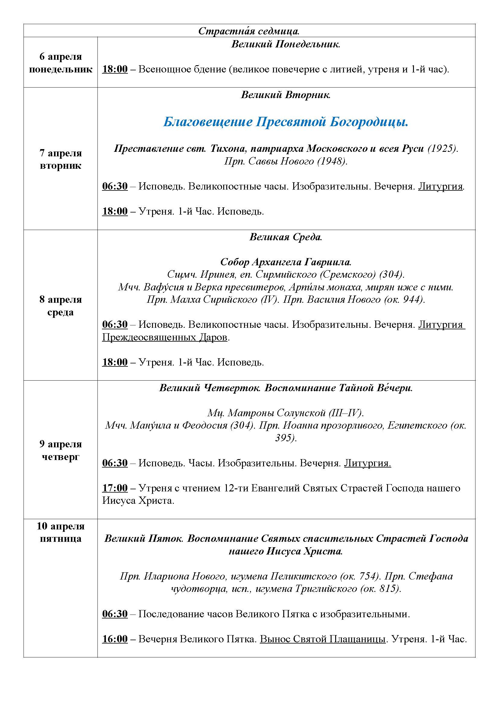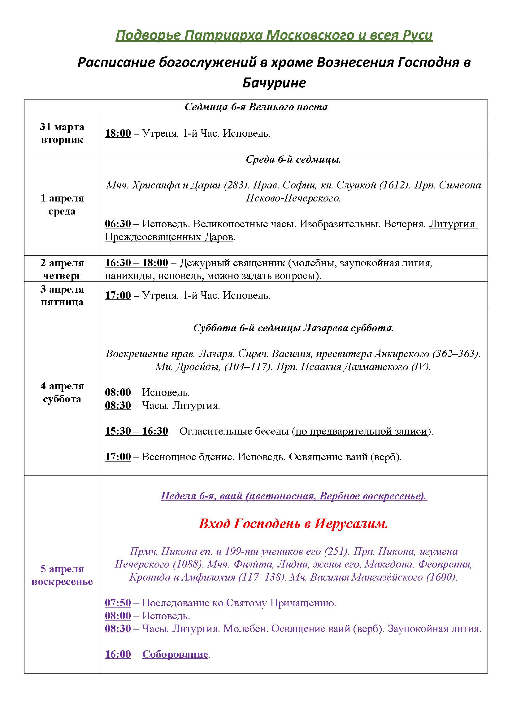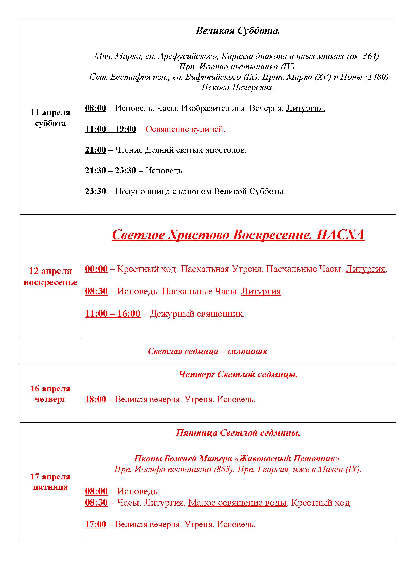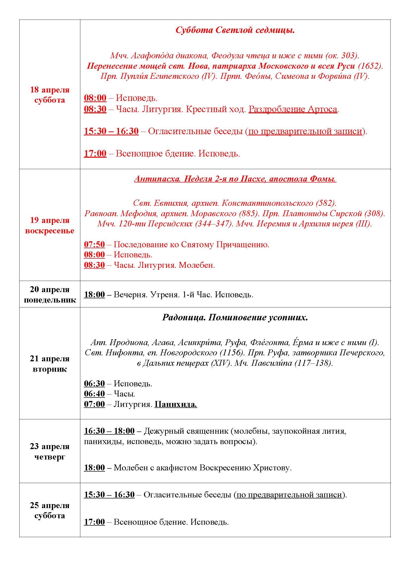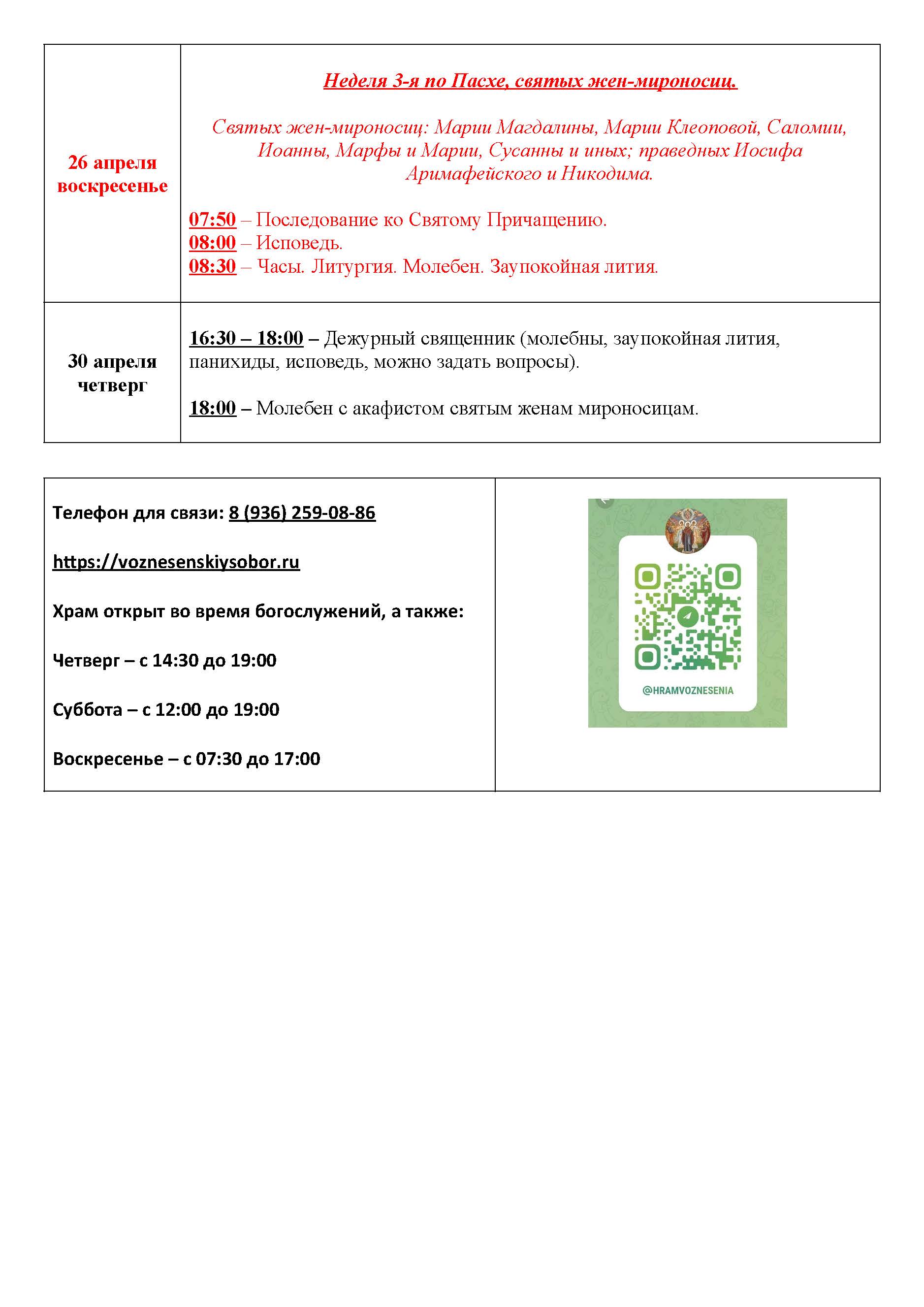Храм открыт во время богослужений, а также: